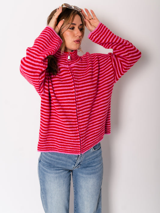 AusverkauftZip Up Streifen Cardigan - Rosa/Rot